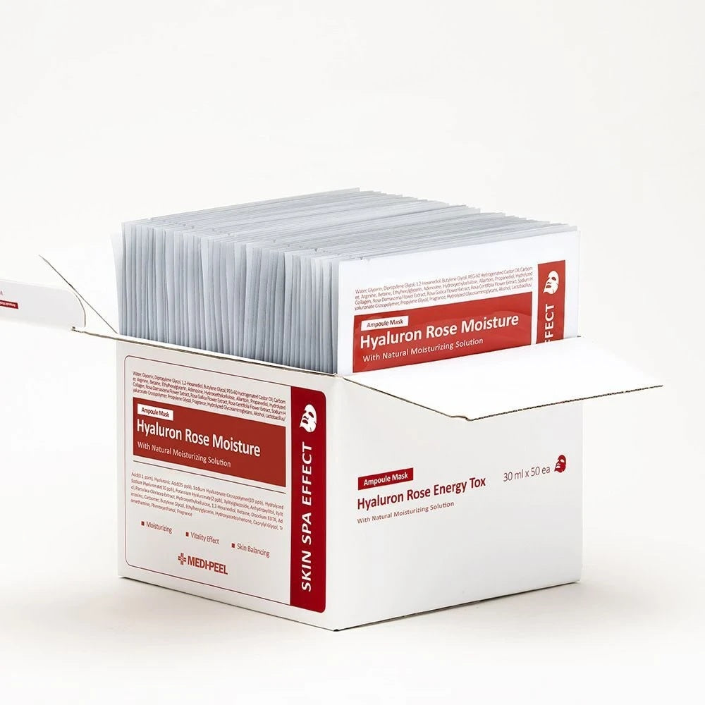 Medi-Peel Hyaluron Rose Moisture Ampoule – tai intensyviai drėkinančios ir odą puoselėjančios lakštinės kaukės, praturtintos hialurono rūgštimi ir rožių ekstraktu. Šios kaukės sukurtos suteikti maksimalią drėgmės dozę, atgaivinti pavargusią odą bei padėti atkurti jos elastingumą ir švytėjimą.
